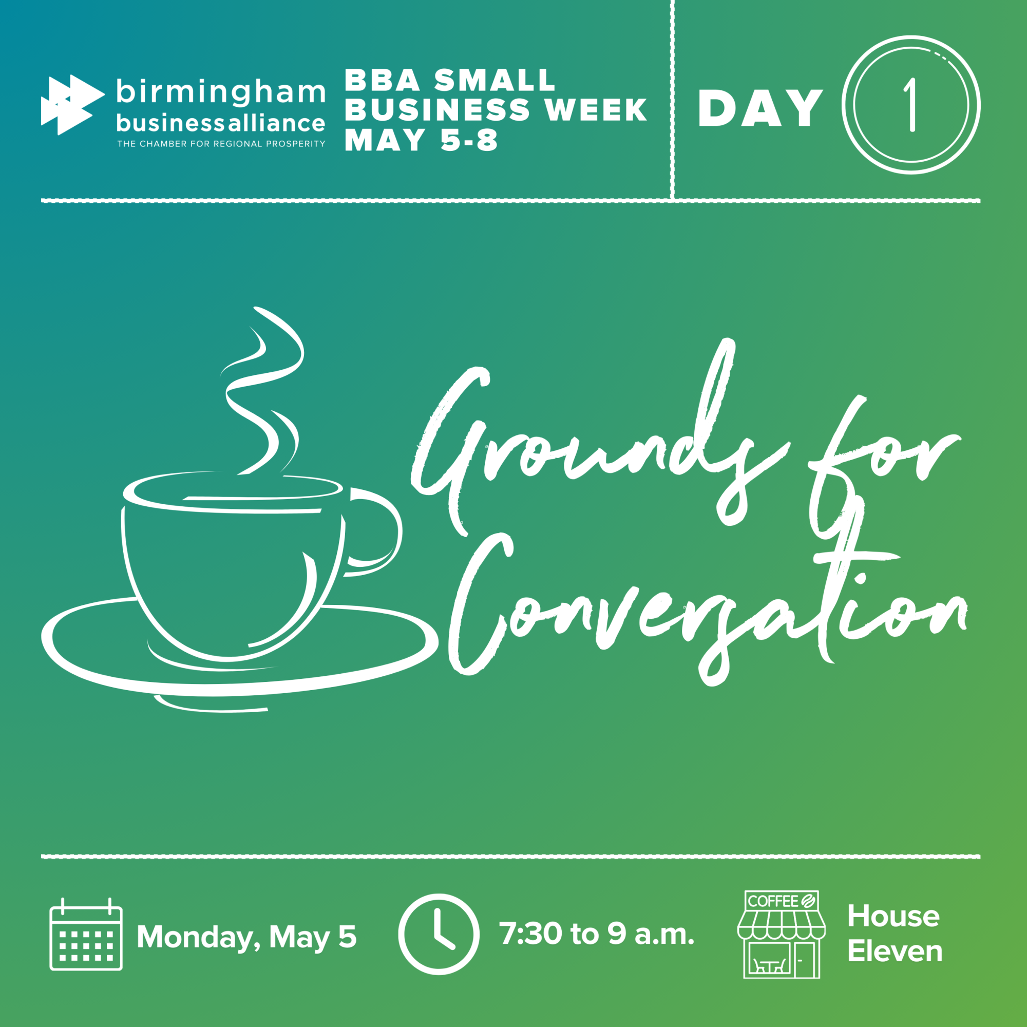 On Monday, May 5 from 7:30 to 9 a.m. at House Eleven, the Birmingham Business Alliance (BBA) invites you to attend our Small Business Week Grounds for Conversation networking event. During this event, make new connections, enjoy a complimentary coffee on us, and get connected with the BBA’s Small Business team, who are advocates for small business growth and success here in Birmingham.