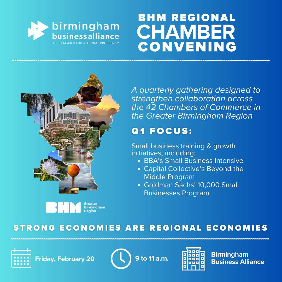 The Birmingham Business Alliance (BBA) is bringing together more than 40 local and regional chambers of commerce from across the seven-county Greater Birmingham Region for a Regional Chamber Convening focused on timely and relevant topics that are specific to our region and leveraging the BBA’s resources to help.