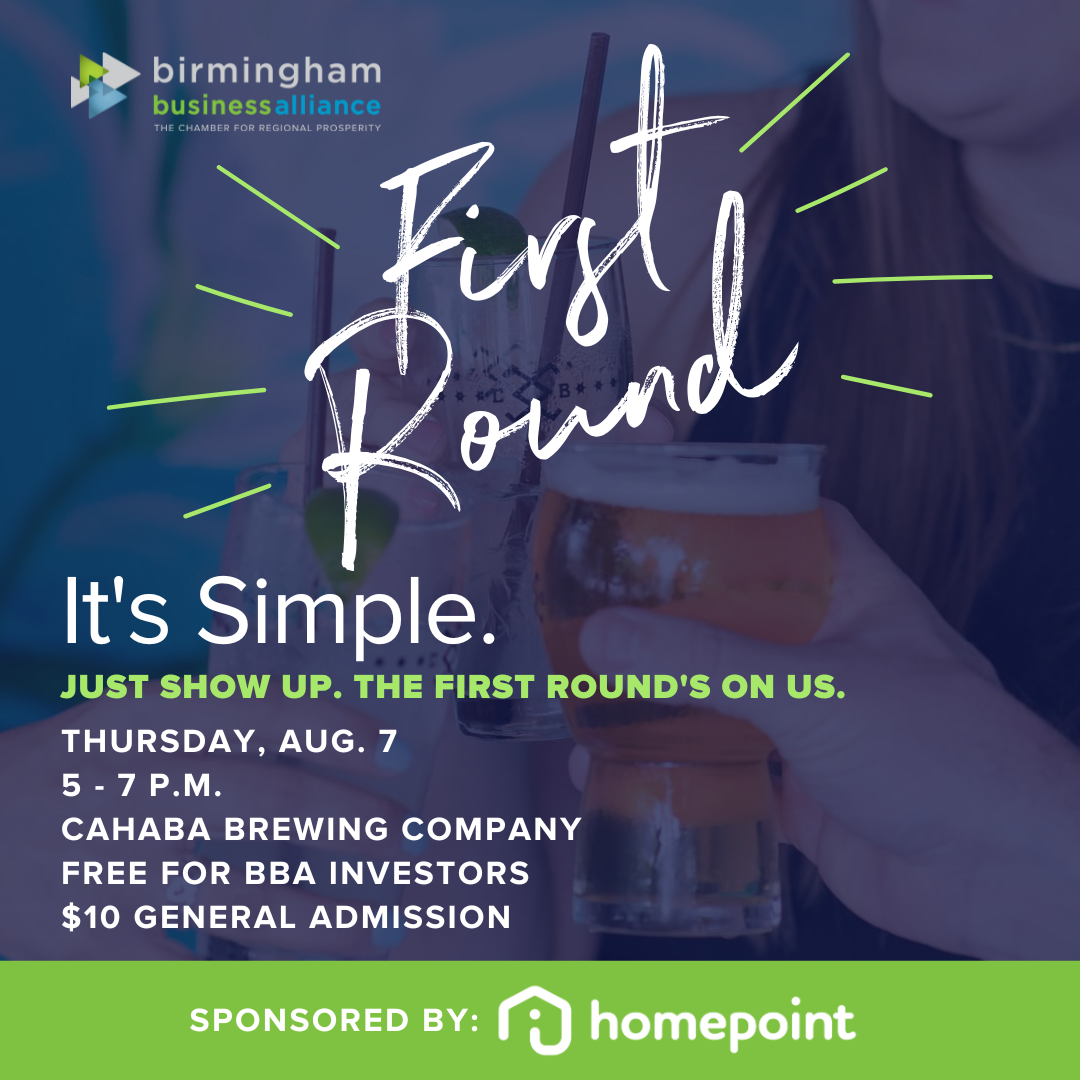 On Thursday, Aug. 7 from 5 to 7 p.m. at Cahaba Brewing, join us for our premier networking event, First Round! Enjoy a complimentary cocktail and two hours of networking with our region's professionals across all industries. This networking event provides professionals in the Birmingham Region the opportunity to meet and mingle after work hours, helping expand their professional networks. Tickets are FREE for BBA investors and $10 for non-investors. This event is graciously sponsored by Homepoint Brokerage, a full-service real estate platform that combines licensed in-house agents with smart technology to make buying and selling homes simpler.