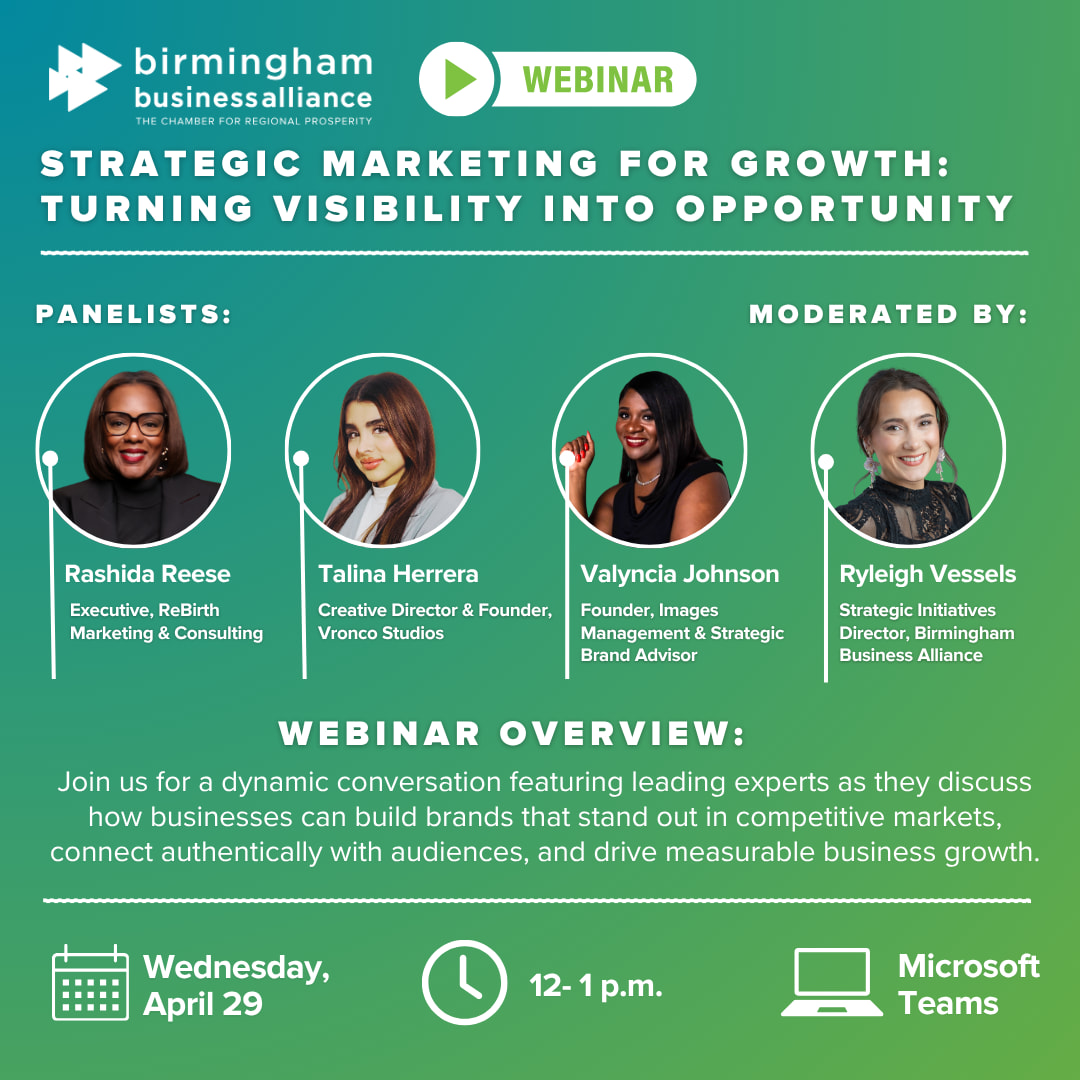 In today’s marketplace, a strong brand is more than a logo or tagline—it is the story a company tells, the experience it creates, and the trust it builds with its audience. Join the Birmingham Business Alliance for a dynamic conversation featuring leading experts in marketing strategy, creative branding, and cultural storytelling. This webinar will explore how businesses can build brands that stand out in competitive markets, connect authentically with audiences, and drive measurable business growth. Our panel of marketing and creative leaders will share practical insights on how companies—from startups to established organizations—can strengthen their brand identity, elevate their messaging, and build long-term visibility.