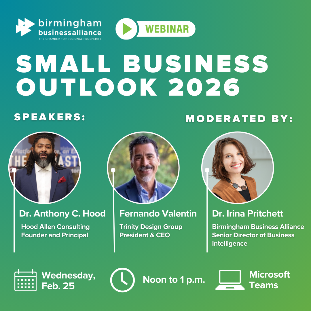 On Wednesday, Feb. 25 from noon to 1 p.m., join the Birmingham Business Alliance (BBA) for our 2026 Small Business Outlook Webinar! Attendees will hear from Dr. Anthony C. Hood and Trinity Design Group President and CEO Fernando Valentin on the critical role that economic forecasts play in helping business leaders understand the direction of markets, labor conditions, capital availability and broader economic forces.