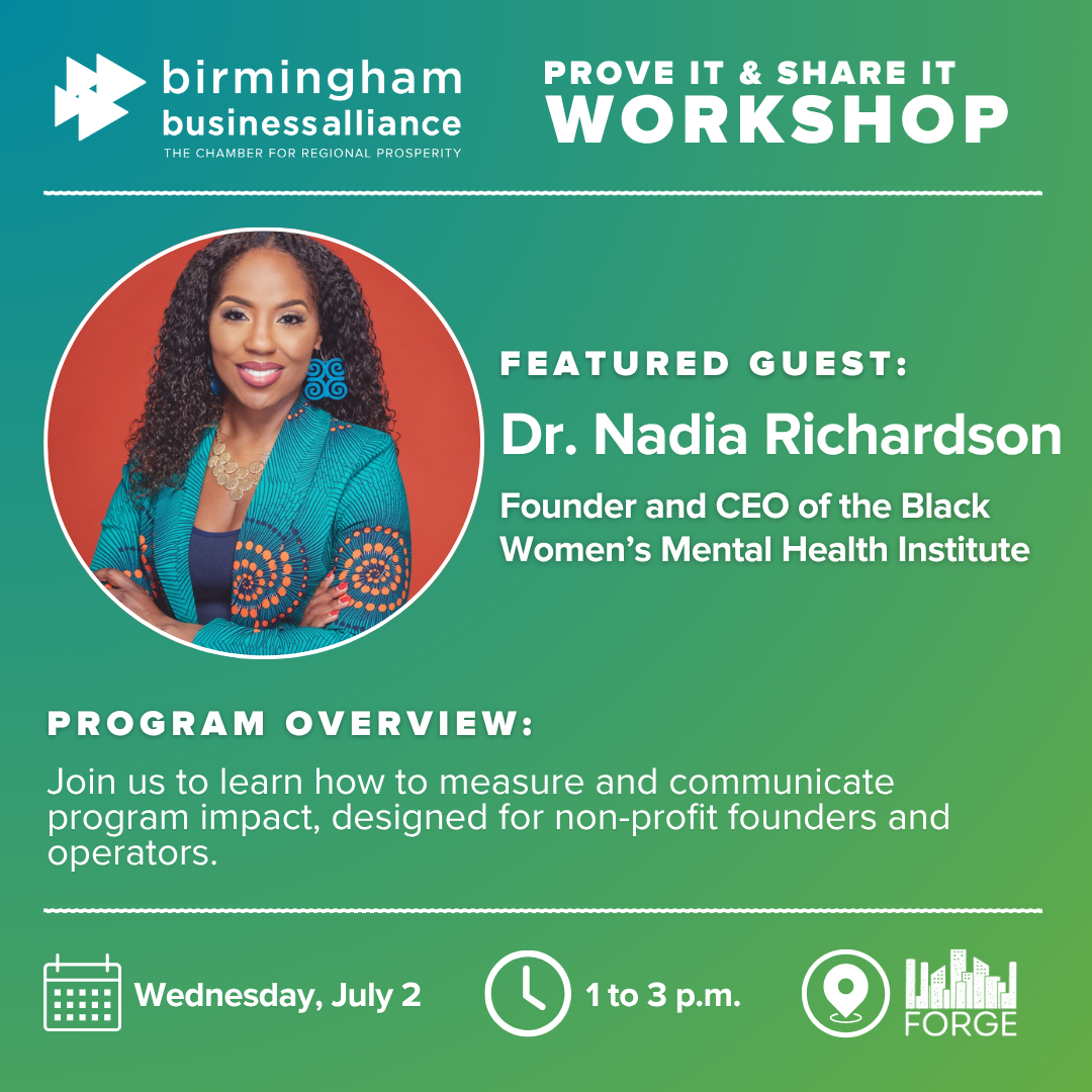 Join us for an inspiring and practical session designed for nonprofit founders, executive directors, operators and staff on Wednesday, July 2 from 1 to 3 p.m. at Forge (120 19th St N #200, Birmingham, AL 35203). Our Prove It & Share It Workshop features Black Women’s Mental Health Institute Founder and CEO Dr. Nadia M. Richardson.