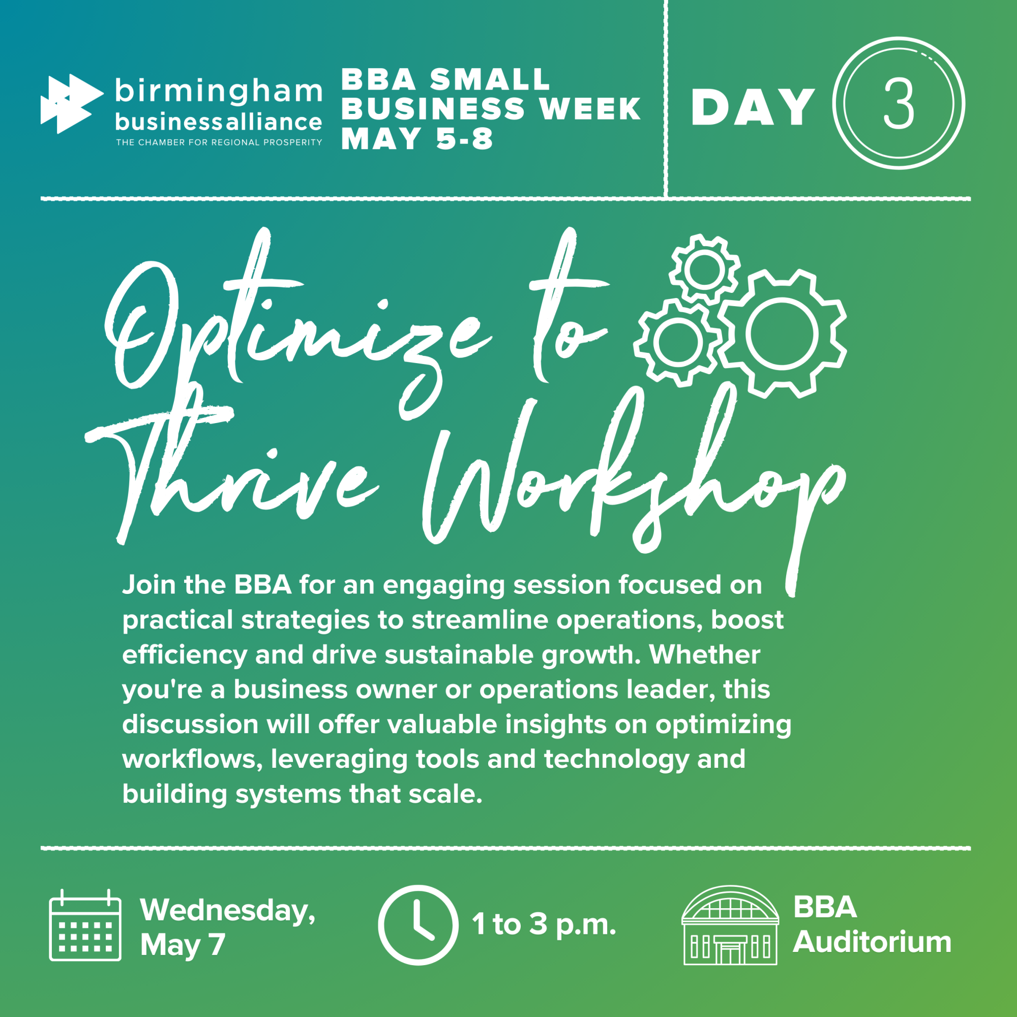 On Wednesday, May 7 from 1 to 3 p.m. in the BBA Auditorium, join the BBA for its Small Business Week “Optimize to Thrive” Workshop for an engaging session focused on practical strategies to streamline operations, boost efficiency and drive sustainable growth. Attendees will hear from Howell Consulting Services CEO and From Scratch Business Advisory Services Managing Partner Carnelle Howell. Whether you're a business owner or operations leader, this discussion will offer valuable insights on optimizing workflows, leveraging tools and technology and building systems that scale.