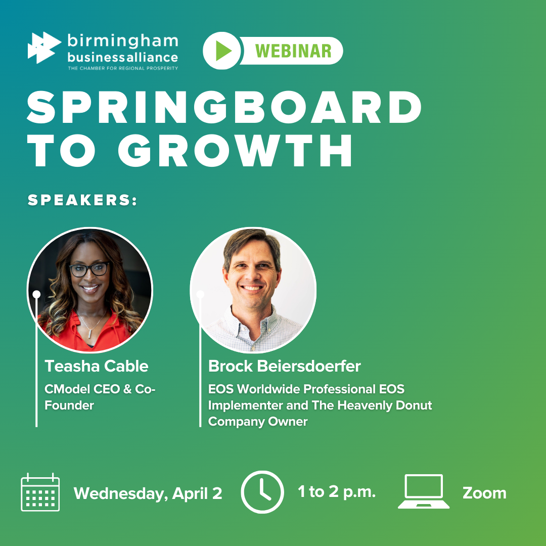 It's officially SPRING! On Wednesday, April 2 from 1 to 2 p.m., we invite you to join CModel CEO & Co-Founder Teasha Cable and EOS Worldwide Professional EOS Implementer and The Heavenly Donut Company Owner Brock Beiersdoerfer for our webinar, "Springboard to Growth."
